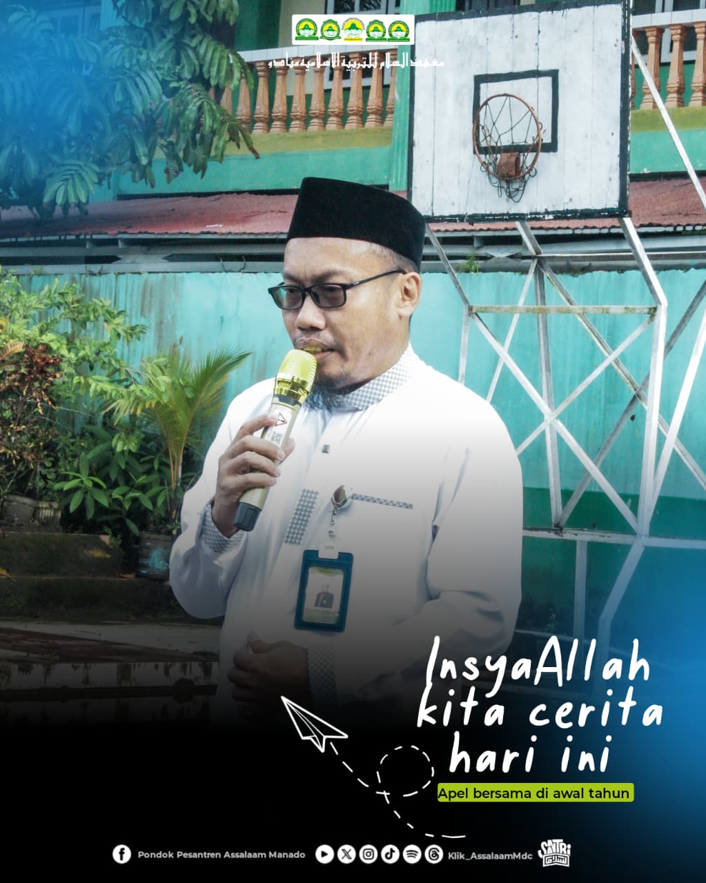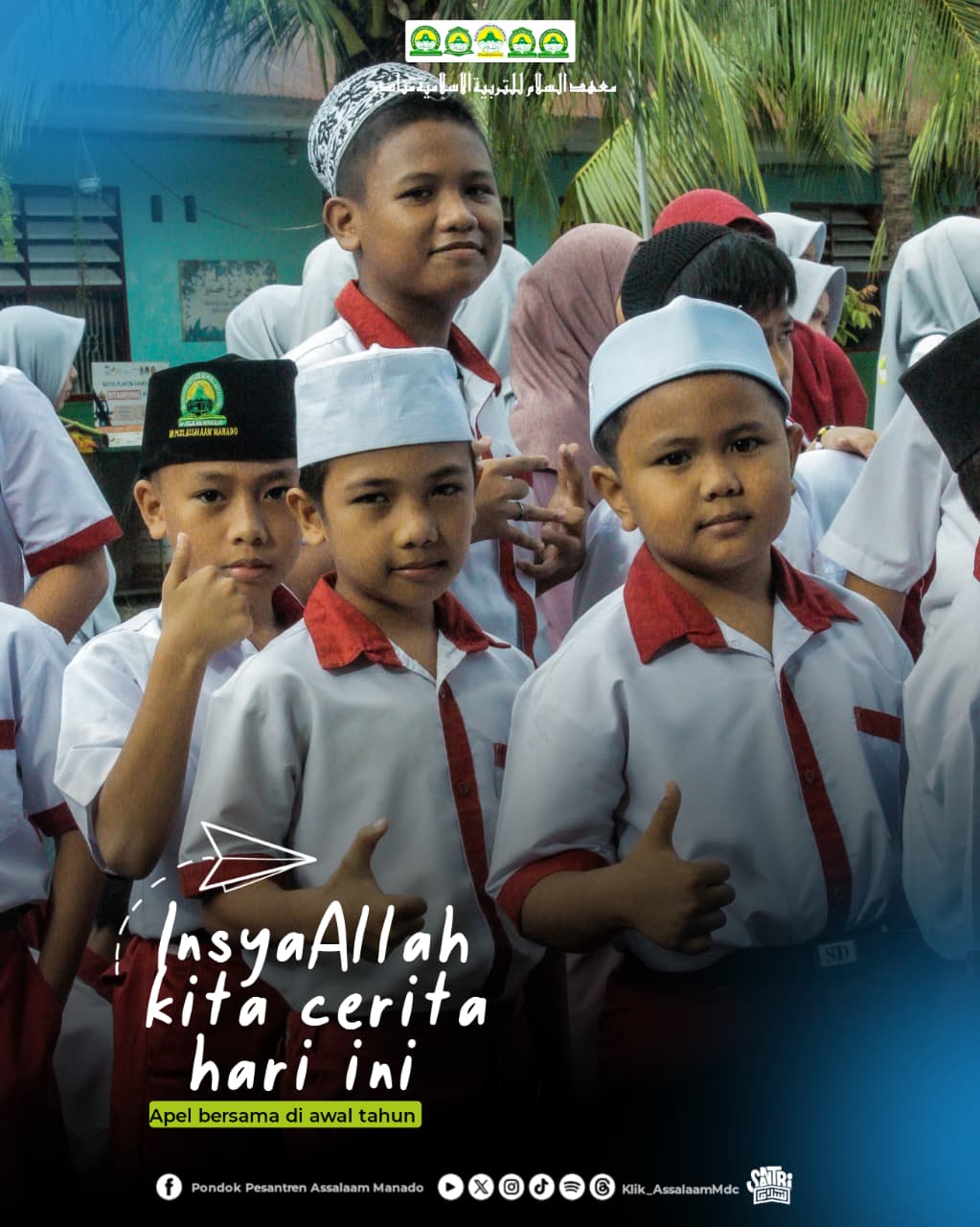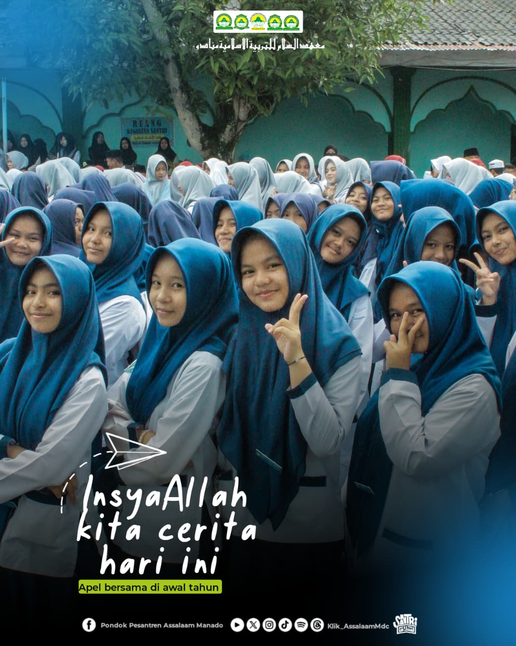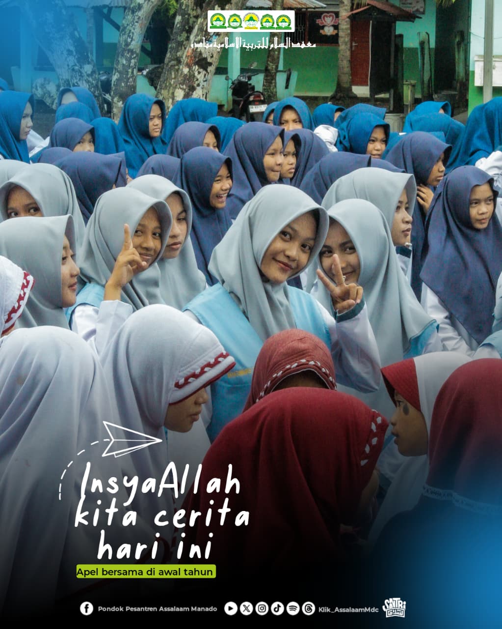 Apel bersama di awal tahun menjadi momentum penting bagi santri dan guru Pondok Pesantren Assalaam Manado untuk menata kembali niat, semangat, dan komitmen dalam menuntut ilmu. Kegiatan ini diikuti oleh seluruh santri serta dewan guru dengan penuh khidmat dan disiplin. Melalui apel awal tahun, pimpinan pondok menyampaikan arahan, evaluasi, serta motivasi agar seluruh civitas pesantren meningkatkan niat, kualitas ibadah, akhlak, dan prestasi di tahun yang baru. Apel bersama juga menjadi sarana memperkuat kebersamaan, ukhuwah, dan rasa tanggung jawab sebagai keluarga besar pesantren. Dengan kebersamaan ini, diharapkan santri dan guru Pondok Pesantren Assalaam Manado mampu melangkah lebih baik, lebih disiplin, dan lebih bersemangat dalam menjalankan aktivitas pendidikan serta pengabdian kepada agama, bangsa, dan umat.
