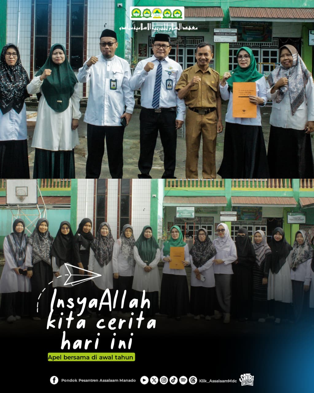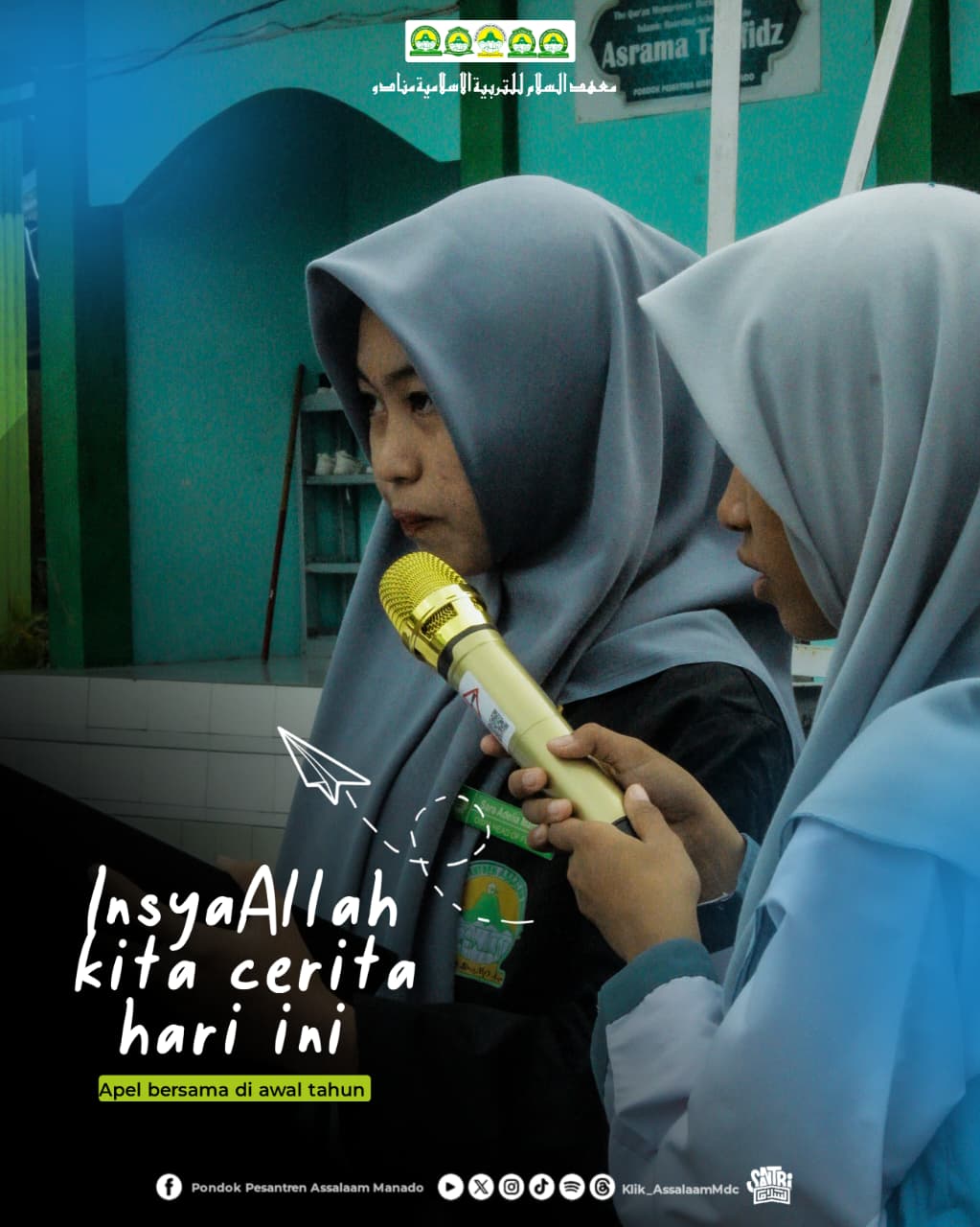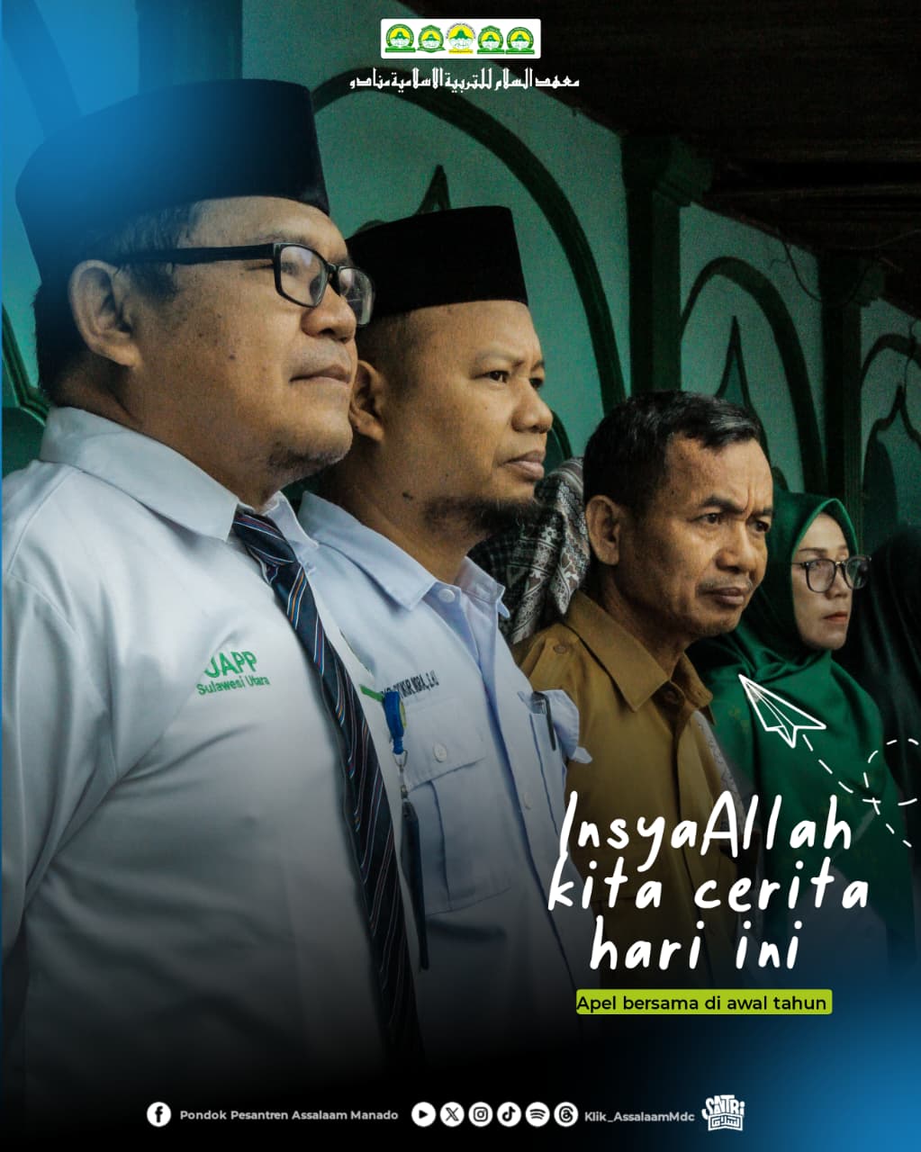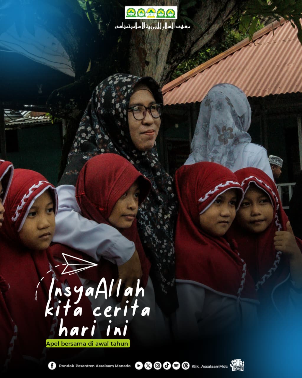 Apel bersama di awal tahun menjadi momentum penting bagi santri dan guru Pondok Pesantren Assalaam Manado untuk menata kembali niat, semangat, dan komitmen dalam menuntut ilmu. Kegiatan ini diikuti oleh seluruh santri serta dewan guru dengan penuh khidmat dan disiplin. Melalui apel awal tahun, pimpinan pondok menyampaikan arahan, evaluasi, serta motivasi agar seluruh civitas pesantren meningkatkan niat, kualitas ibadah, akhlak, dan prestasi di tahun yang baru. Apel bersama juga menjadi sarana memperkuat kebersamaan, ukhuwah, dan rasa tanggung jawab sebagai keluarga besar pesantren. Dengan kebersamaan ini, diharapkan santri dan guru Pondok Pesantren Assalaam Manado mampu melangkah lebih baik, lebih disiplin, dan lebih bersemangat dalam menjalankan aktivitas pendidikan serta pengabdian kepada agama, bangsa, dan umat.