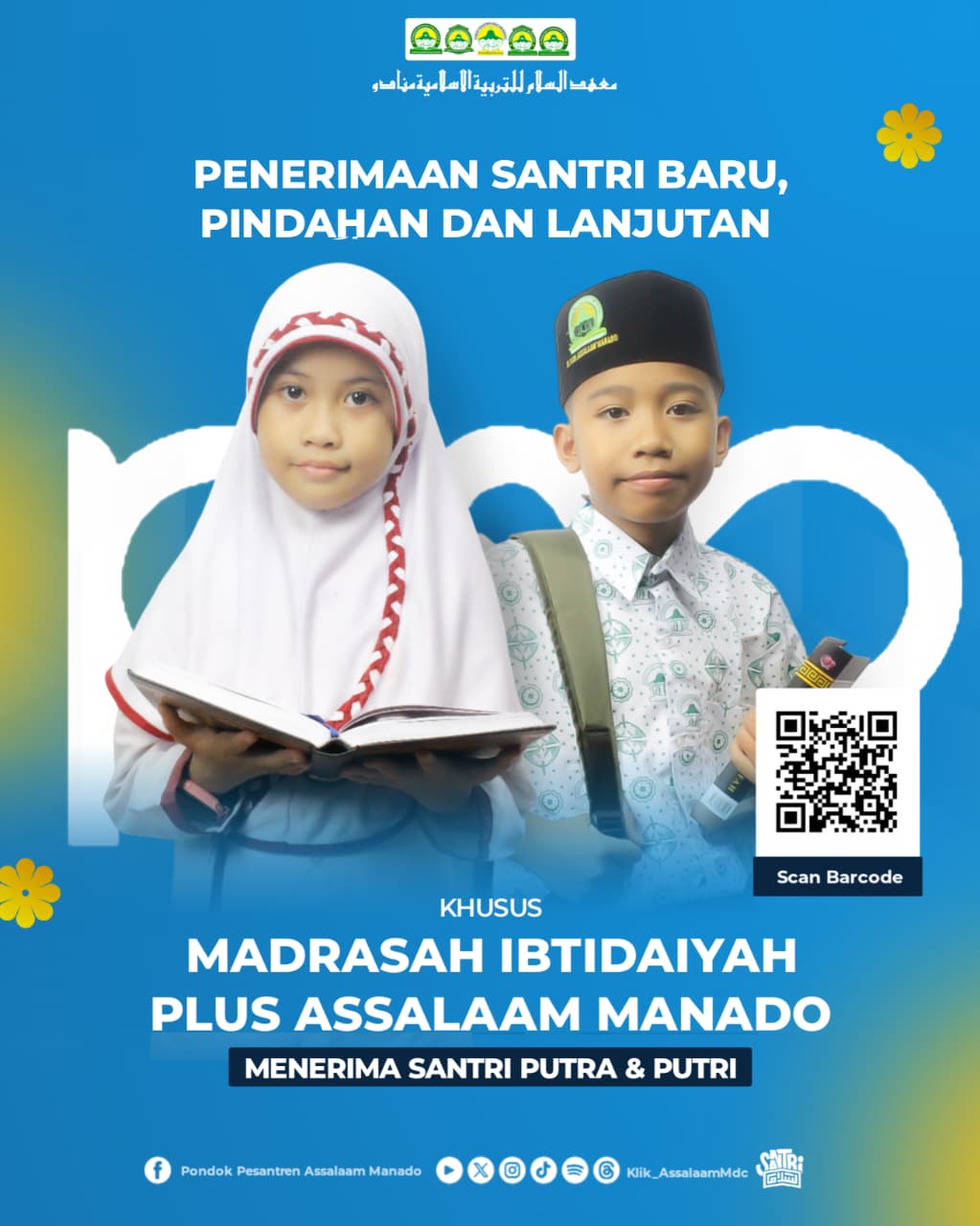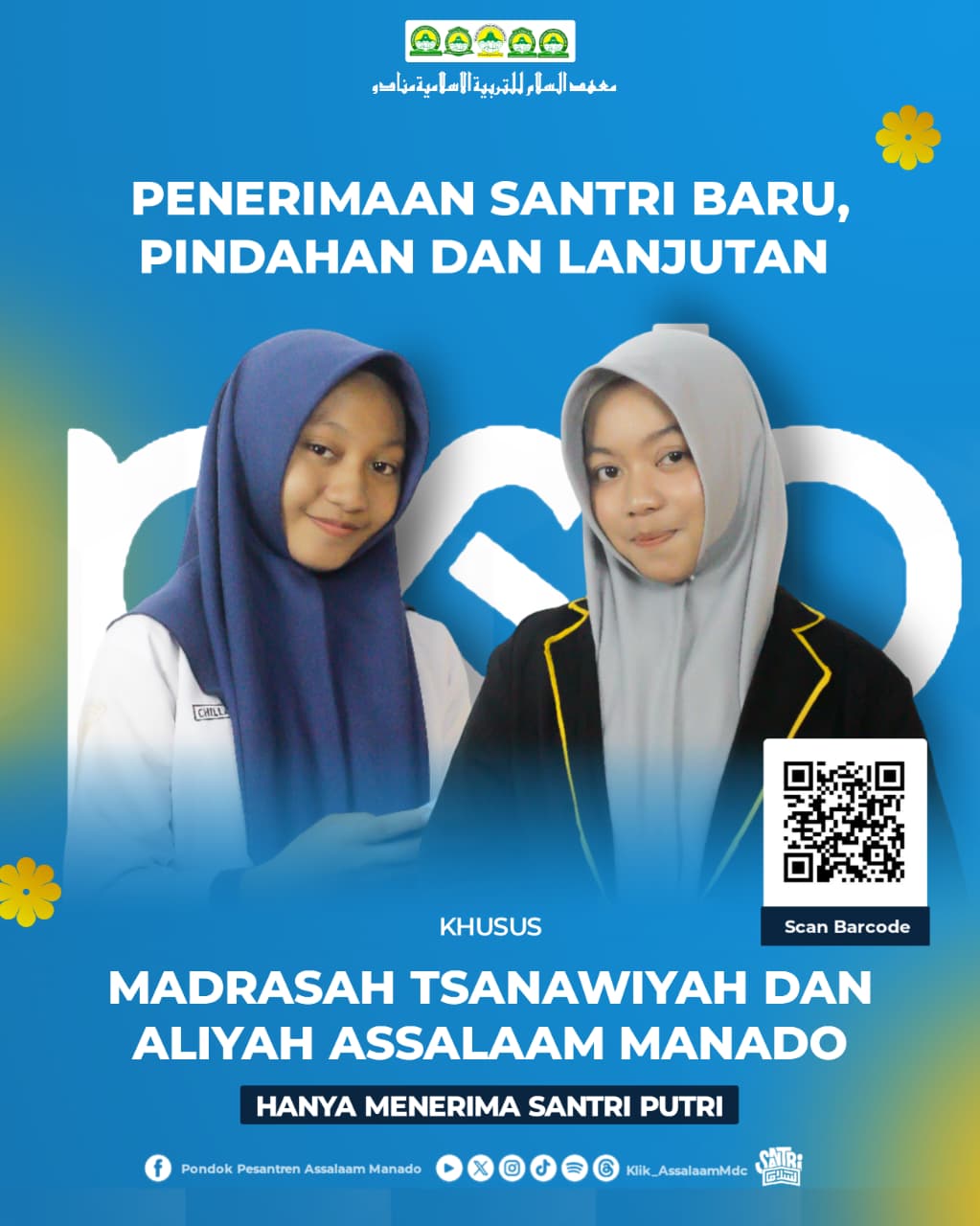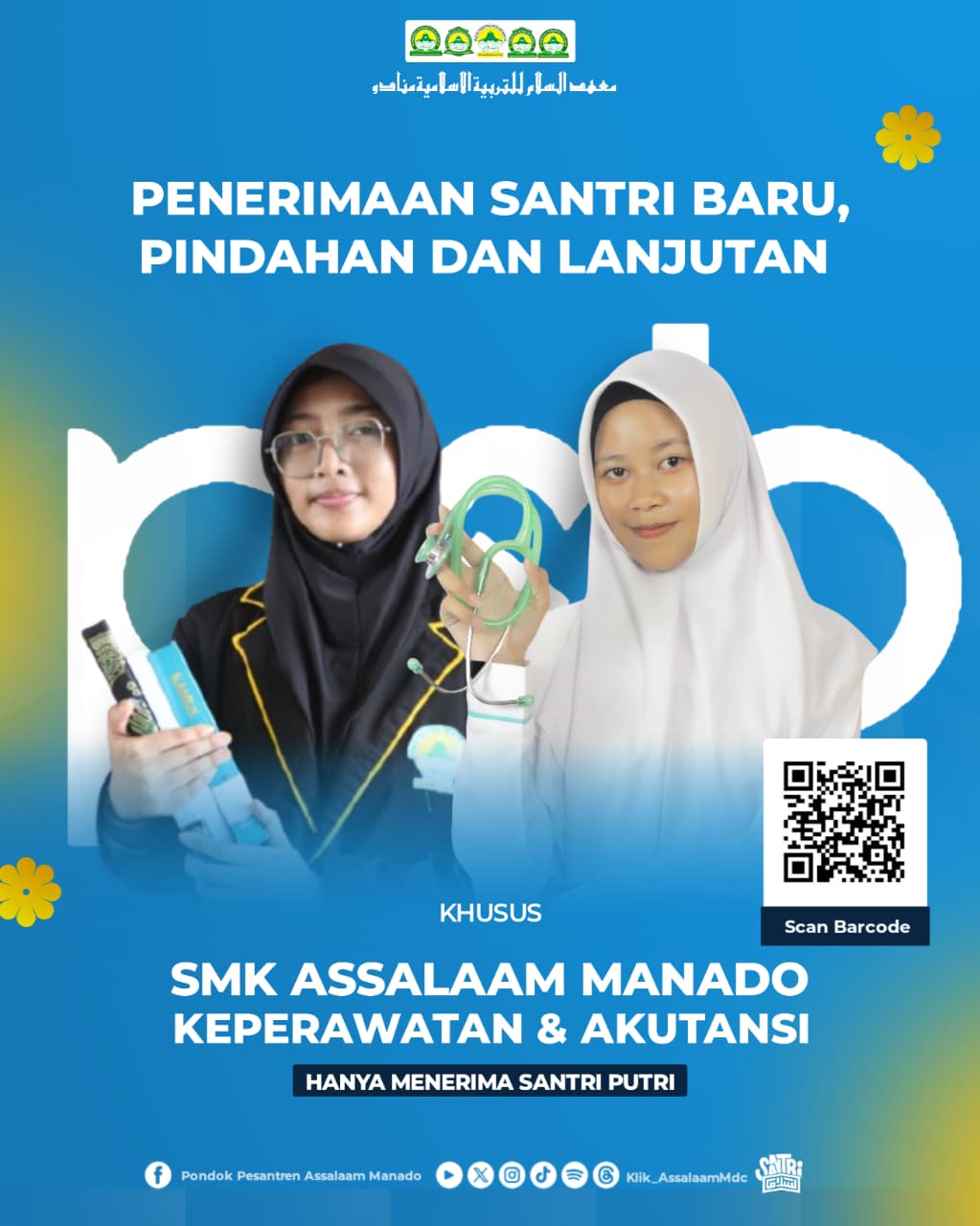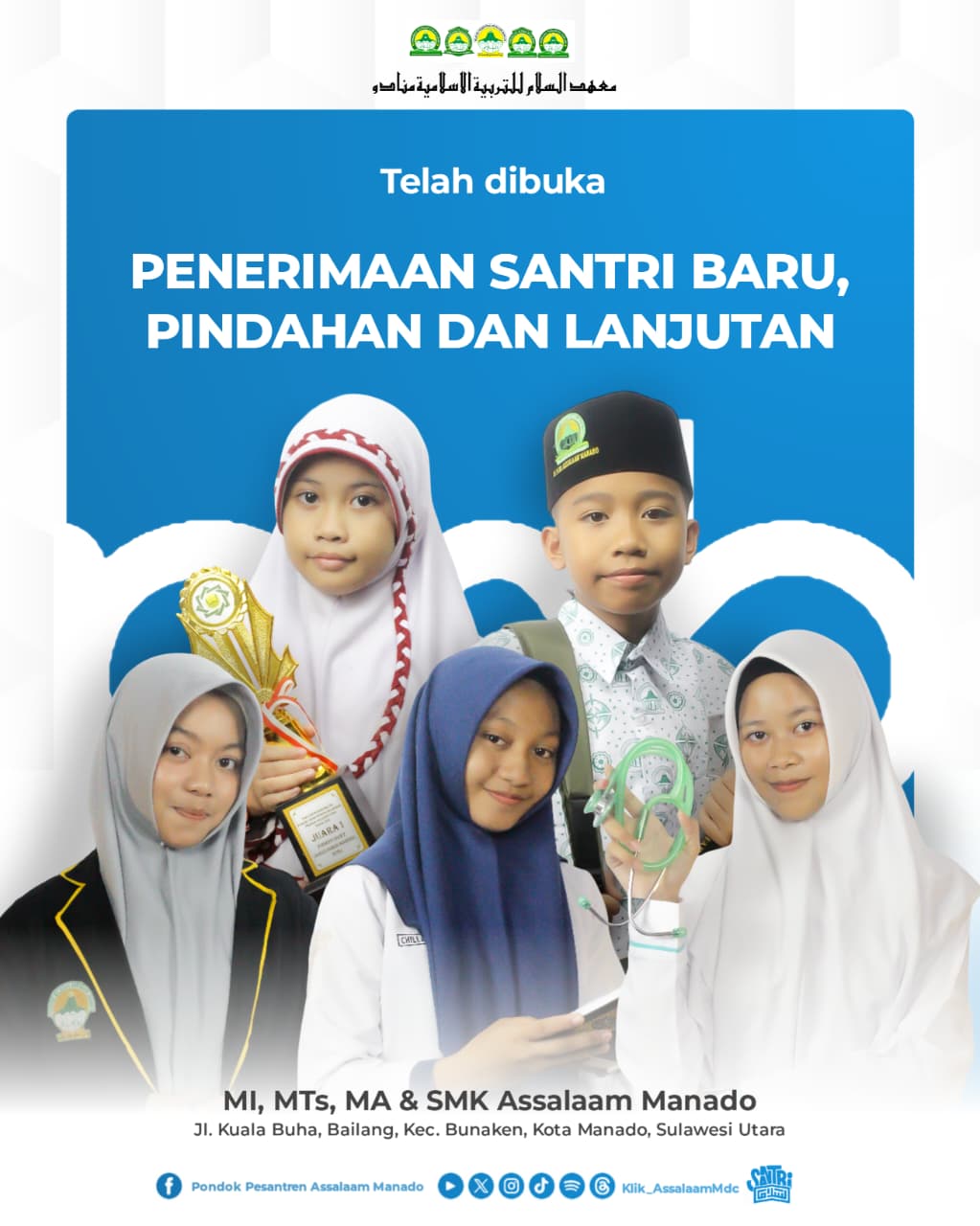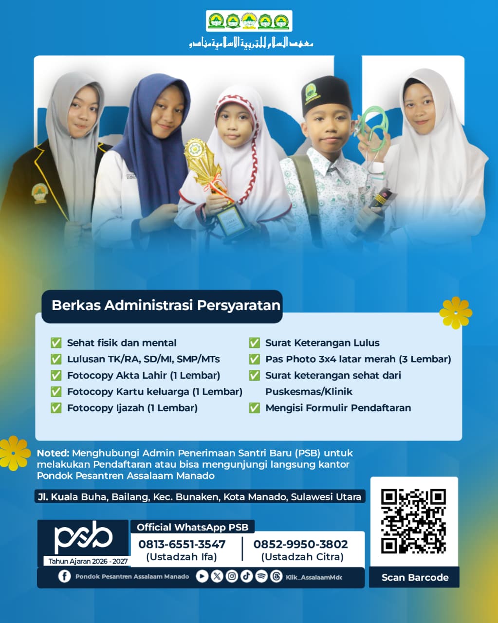 Alhamdulillah, Pondok Pesantren Assalaam Manado resmi membuka Penerimaan Santri Baru (PSB) Tahun Ajaran 2026β2027* untuk jenjang MI, MTs, MA, dan SMK. Kami mengundang putra-putri terbaik untuk bergabung dalam lingkungan pendidikan Islami yang menekankan pembinaan akidah, akhlak, ilmu pengetahuan, serta keterampilan. Jangan lewatkan kesempatan ini untuk menjadi bagian dari keluarga besar Assalaam Manado.